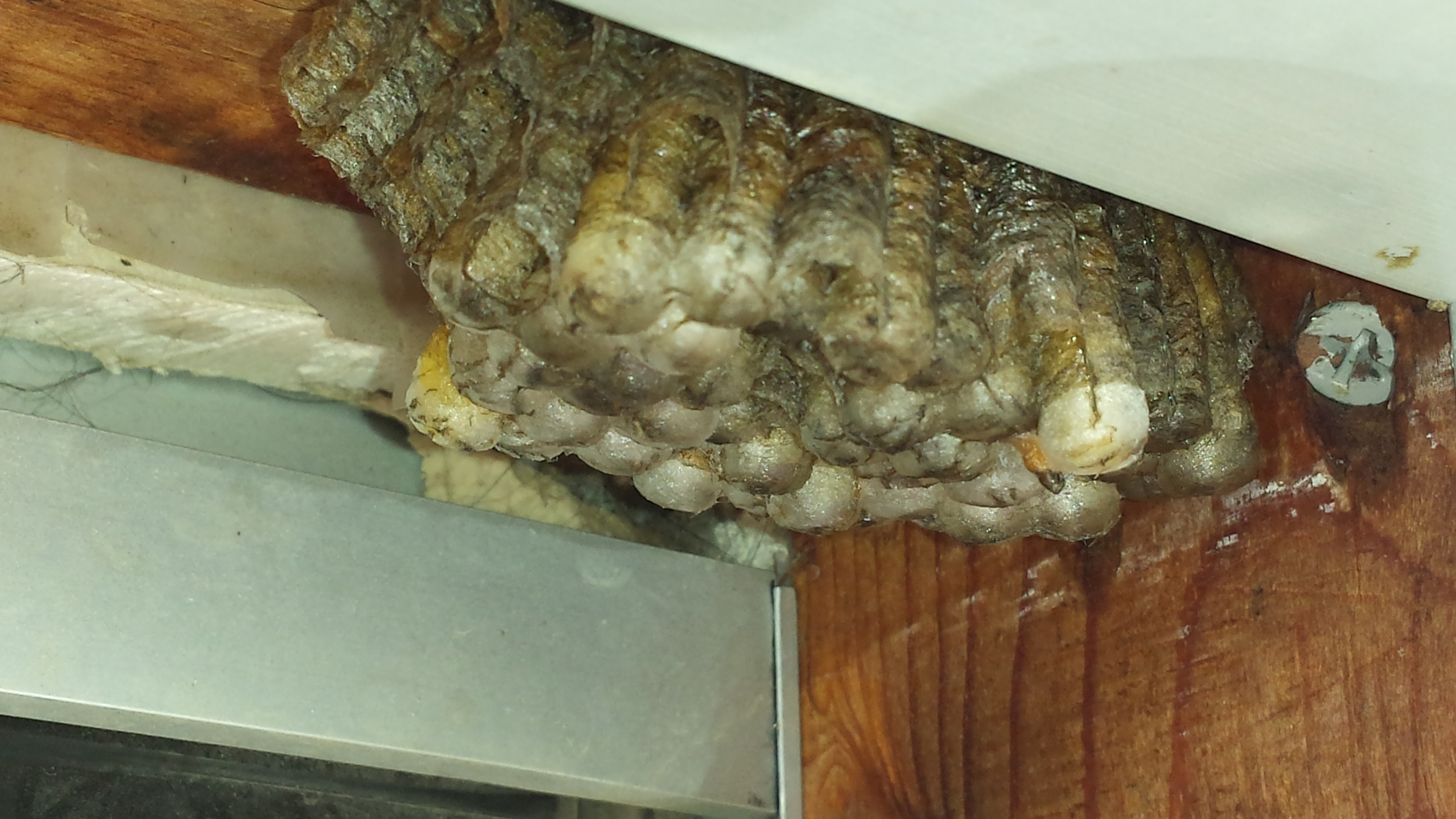 What is it baby? Oh, my goodness! Come here baby, let’s get you out of there. I can’t believe it there’s a hornet’s nest in your doggie door. Poor baby. Come here honey dog. I don’t see any parts of you that are swelling.